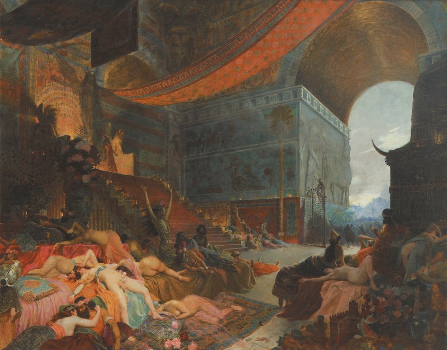 Eighteen years before Noble Johnson stepped foot onto Griffith’s gargantuan movie set, while Omaha Exposition tourists reveled in the exciting prospects of expanding Manifest Destiny beyond America’s continental borders, gawking at Black people in the Old Plantation, cheering as subjugated Native Americans staged sham battles with white men in redface, and standing in awe at the way it was all so beautifully and almost supernaturally lit up at night, they also swung by to see what was billed as *the* work of art of the 19th century. A single painting hung, enshrined in its own building, with advertisers drawing tourists in using signs declaring it the winner of a fancy contest in Paris. French painter Georges Rochegrosse depicted the destruction of one of the great cities of the ancient world, and the piece was titled simply, ‘The Fall of Babylon.’